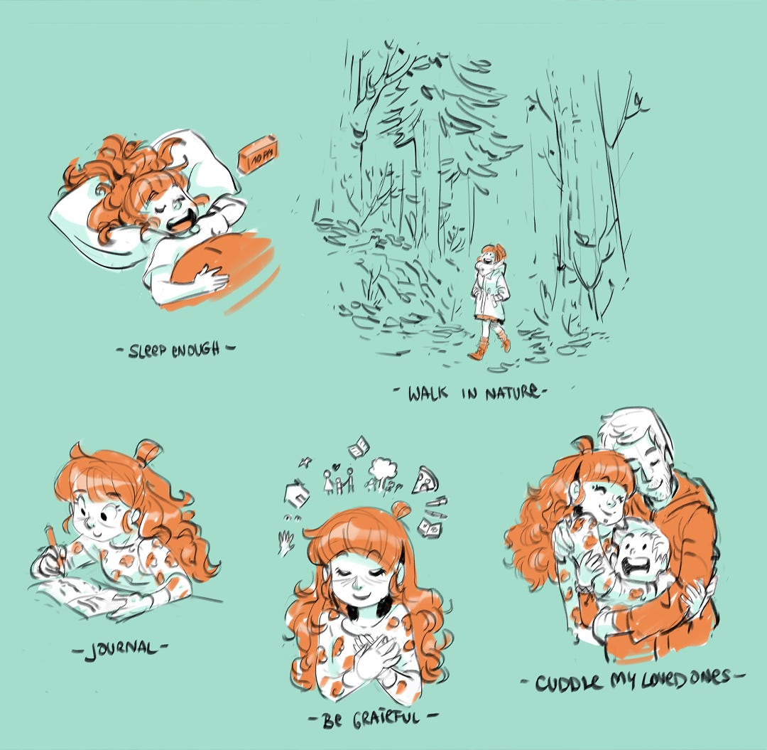 Draw stuff that makes me feel good (nature characters, storyies) not what I admire in others. (Taking inspiration is great but it must alines with me)