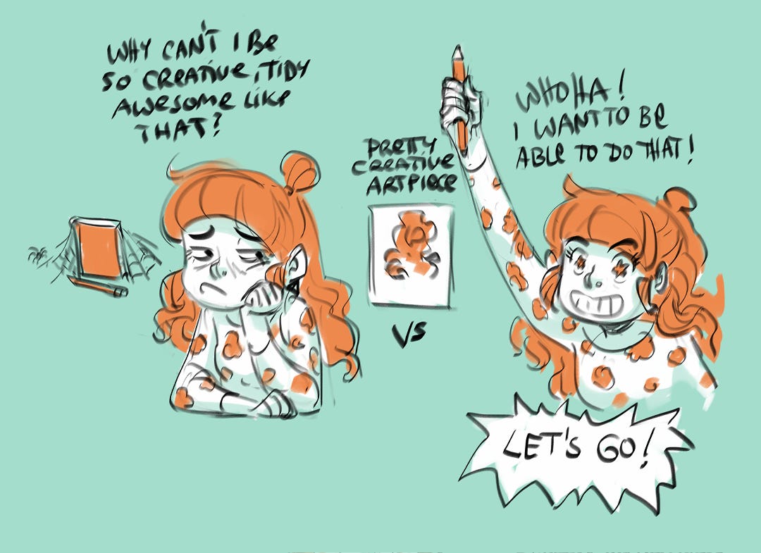 I’ve been musing about comparison since I have had several interessting commments on the topic. Maybe comparison is not the problem. In this last newsletter I had talked about shouting at myself to stop the comparison to other artist that seemingly were more successful than myself, but not comparing myself is that even possible? Is it as set up for failure and unhappiness to tell myself to stop something that is kinda built in and thus I when I compare myself I will feel bad ontop of evrything for not managing to stop the comparison.