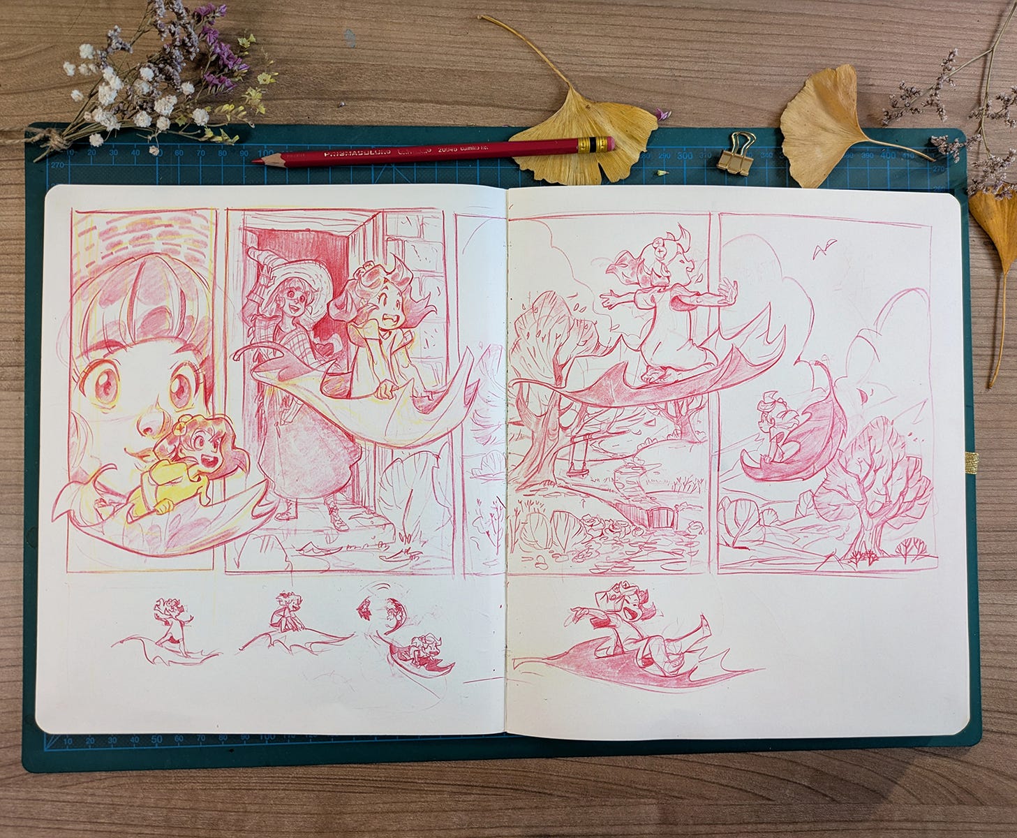 Here I had an idea of the sequence of my witch blowing the small person on the leaf along in bed and had to quickly sketch it the next morning.