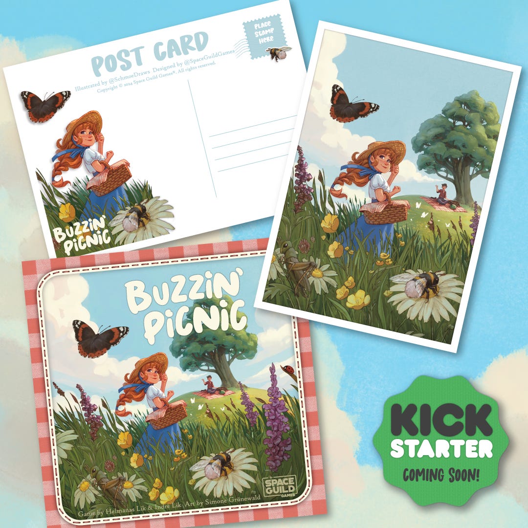 Designed by freshly baked tabletop game publishers - Space Guild Games, their newest game "Buzzin' Picnic" is now nearly finished and will be coming to Kickstarter this spring! If you want to learn more about the game, please check them out Space Guild Games and visit their website www.buzzinpicnic.com where you can subscribe to the newsletter and bee part of the Buzz! The first 100 subscribers will receive a limited Buzzin’ Picnic postcard with my art from the game!
