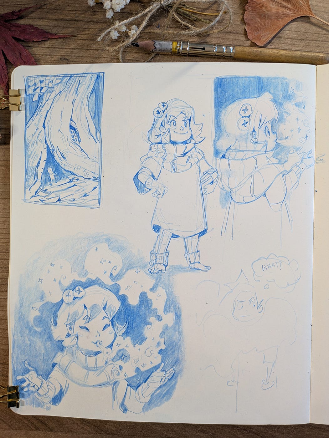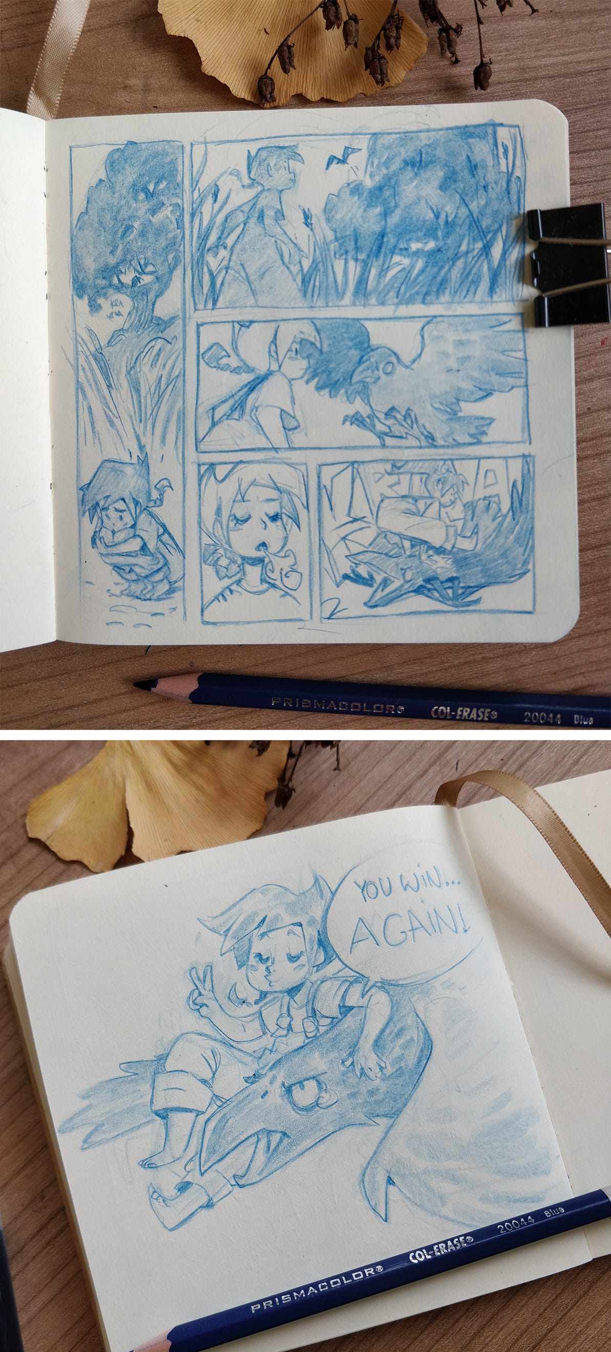 I recently started this page not knowing what to draw I just opened Pinterest and saw a hollow tree… that produced the first panel. From there I wanted to show the attitude of the character coming out of the tree and then I thought “hmm it probably is cold”… The last sketch where a different character wonders where all the mist is coming from needs to be completed.